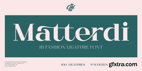 Apresentando Matterdi, uma família elegante de serifas de alta moda com toneladas de ligaduras exclusivas e modernas.Esta versátil família de serifas contém mais de 100 ligaduras e alternativos elegantes e únicos. 9 pesos disponíveis de Fino a Preto, o que oferece muitas possibilidades de layout dos seus próximos projetos. Perfeito para marcas de palavras, monogramas, logotipos, projetos de identidade visual ou para usar como fonte da web.